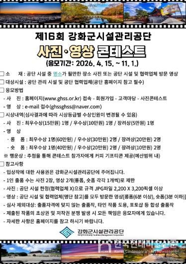 한국현대미술신문 박재남 기자 | 강화군시설관리공단이 ‘제16회 강화군시설관리공단 사진·영상 콘테스트’를 개최한다.