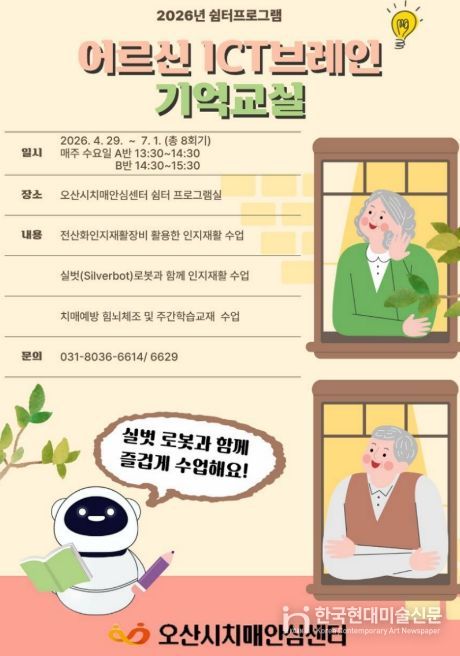 한국현대미술신문 배윤섭 기자 | 오산시치매안심센터는 오는 4월 29일부터 경증 치매환자를 위한 쉼터 프로그램 ‘ICT 브레인 기억 교실’을 운영한다고 밝혔다.