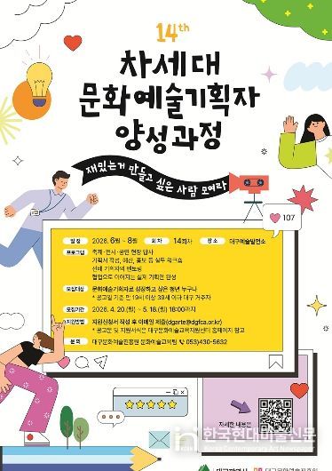 한국현대미술신문 정소영 기자 | 대구문화예술진흥원 문화예술본부는 대구 지역 자원을 기반으로 문화예술 생태계를 이끌어갈 인재를 양성하기 위한 ‘2026 차세대 문화예술기획자 양성 과정’ 교육생을 모집한다.