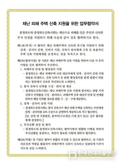 협약에 따라 도는 신속한 인·허가 등 관련 행정절차 처리를 협조하고, 충북건축사회는 설계·감리비의 최대 50% 수준 감면 및 전문 지원체계 구축 등 피해 도민은 즉각적인 기술 자문과 설계를 지원받을 수 있는 체계를 운영한다.