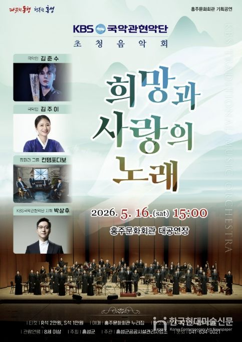 한국현대미술신문 신정은 기자 | 홍성군 홍주문화회관은 오는 5월 16일 오후 3시, 가정의 달 특별 기획으로 'KBS국악관현악단 초청음악회 - 희망과 사랑의 노래'를 무대에 올린다.