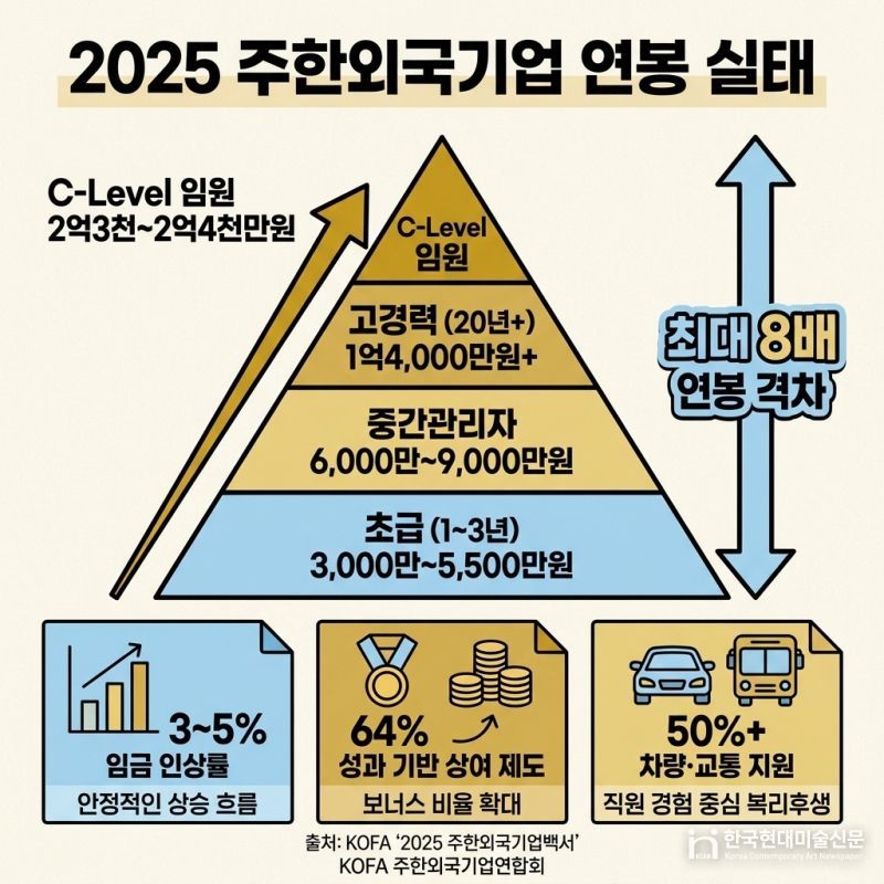 한국현대미술신문 김미정 기자 | 주한외국기업연합회(상임대표 김종철, KOFA)는 ‘2025 주한외국기업백서’ 혁신판을 발표하고, 작년 6월 실시한 주한외국기업 급여 및 상여금 실태조사와 함께 복리후생 조사 결과를 포함해 공개했다. 이번 백서는 7년째 발간되는 자료로, 기존 조사 대비 한층 고도화된 분석 체계를 적용해 글로벌 전문 조사기관 수준의 HR 리포트로 업그레이드됐다는 평가를 받고 있다.