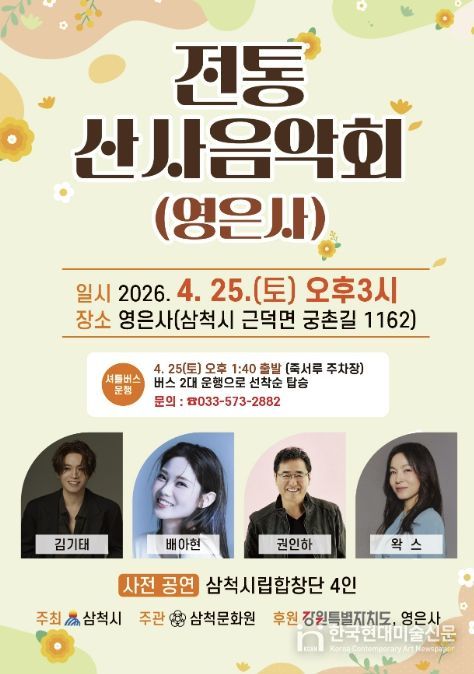 한국현대미술신문 원진 기자 | 삼척시는 4월 25일 근덕면 영은사에서 자연과 전통이 어우러진 '전통 산사 숲속 음악회'를 개최한다고 밝혔다.