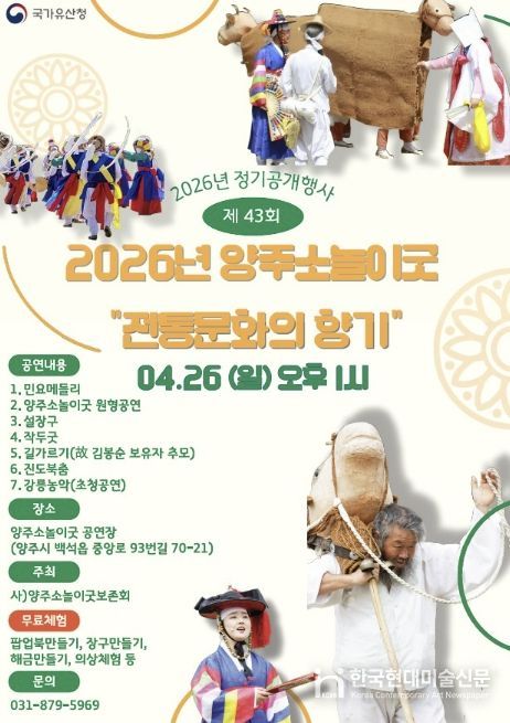 한국현대미술신문 배윤섭 기자 | 양주시는 국가유산청의 지원을 받아 ‘제43회 양주소놀이굿 정기공개행사’를 오는 26일 오후 1시, 양주소놀이굿 전수교육관 공연장에서 개최한다고 밝혔다.