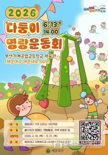한국현대미술신문 정소영 기자 | 해운대구는 다자녀가정 우대 및 가족친화적 분위기 조성을 위해 '2026년 다둥이 명랑 운동회'에 참여할 다자녀가족 100가정을 모집한다.