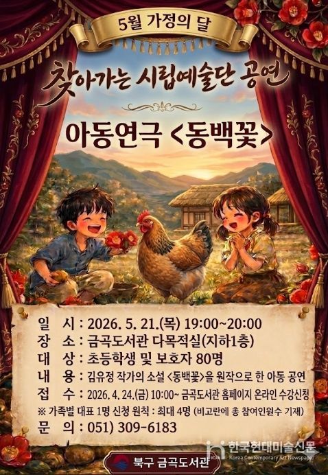 한국현대미술신문 정소영 기자 | 부산 북구는 오는 5월 21일 저녁 7시, 5월 가정의 달을 맞아 금곡도서관에서 지역 주민을 대상으로 김유정 작가의 단편소설 ‘동백꽃’을 원작으로 한 아동연극 공연을 개최한다고 밝혔다.