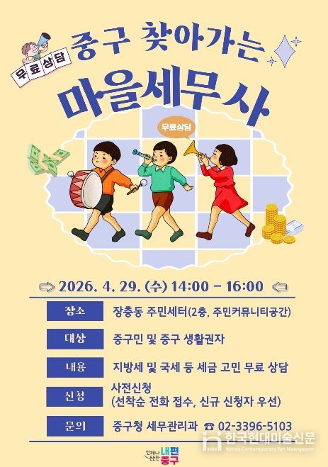 한국현대미술신문 배건 기자 | 서울 중구는 구민들이 일상에서 겪는 세금 고민을 보다 쉽고 편하게 해결할 수 있도록 오는 29일 오후 2시 장충동 주민센터 2층에서 '찾아가는 마을세무사'를 운영한다.