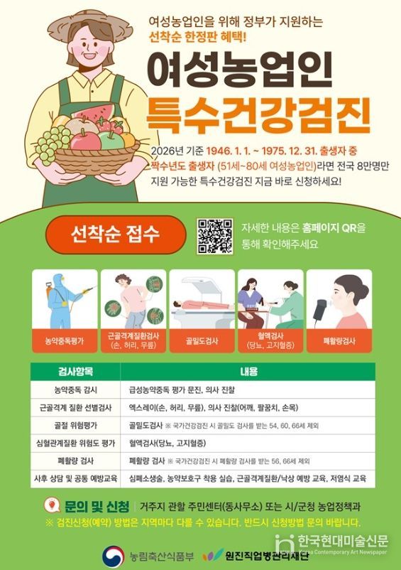 한국현대미술신문 정소영 기자 | 기장군은 여성농업인의 건강 증진과 복지 향상을 위해 ‘2026년 여성농업인 특수건강검진 지원사업’을 본격 추진한다고 22일 밝혔다.