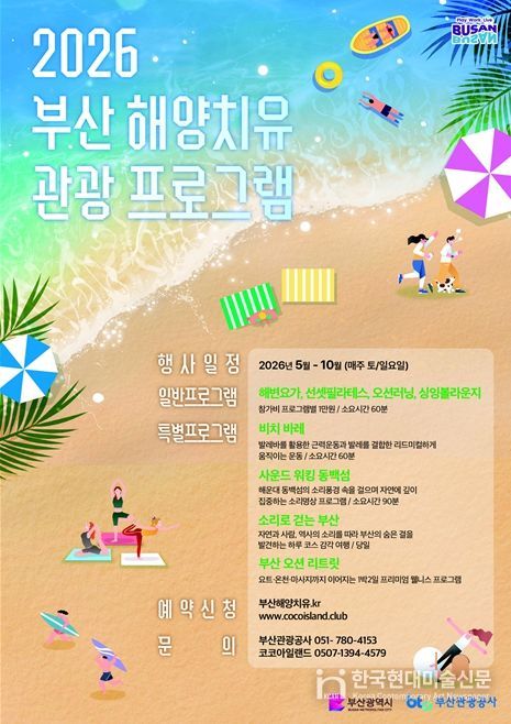 한국현대미술신문 정소영 기자 | 부산시는 오는 5월 1일부터 10월까지 매주 토·일요일에 부산의 7개 해수욕장(해운대, 송정, 광안리, 송도, 다대포, 일광, 임랑)과 동백섬 일원에서 '2026 해양치유 관광 프로그램'을 운영한다고 밝혔다.