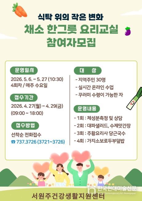 한국현대미술신문 원진 기자 | 서원주건강생활지원센터는 증가하는 만성질환에 대응하기 위한 ‘식탁 위의 작은 변화, 채소 한그릇 요리교실’ 프로그램 참여자를 모집한다.