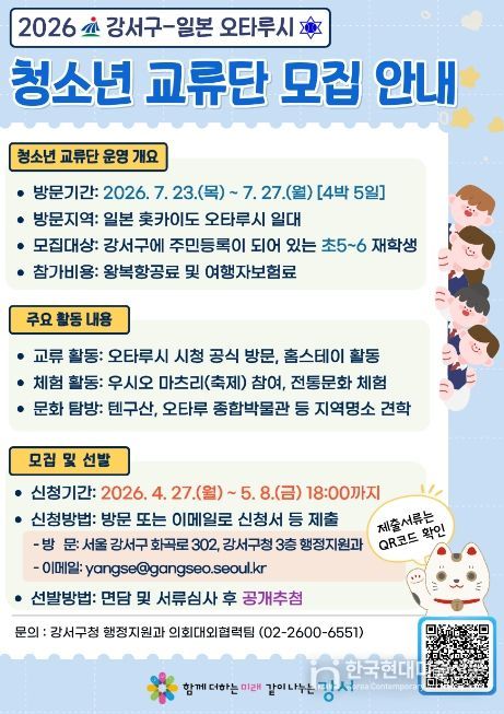 신청 기간은 4월 27일부터 5월 8일까지이며, 참여를 희망하는 경우 신청서, 학교장 추천서 등 구비서류를 지참해 강서구청 행정지원과(본관 3층)를 방문하거나 이메일로 신청하면 된다.