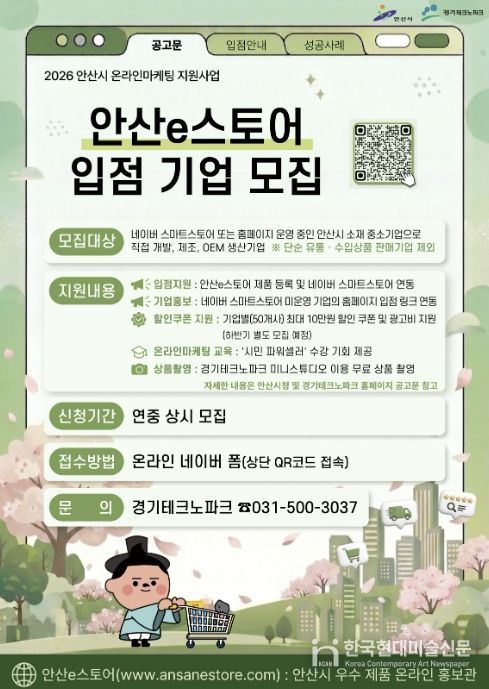 한국현대미술신문 배윤섭 기자 | 안산시는 관내 중소기업의 판로 확대와 홍보 강화를 위해 안산시 우수 제품 온라인 홍보관 ‘안산e스토어’에 신규 입점할 기업을 모집한다고 23일 밝혔다.