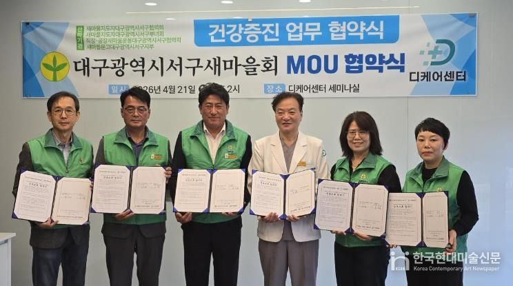 한국현대미술신문 정소영 기자 | 대구광역시서구새마을회는 지난 4월 21일 오후 2시, 디케어센터 세미나실에서 디케어센터와 서구새마을회지도자 및 가족의 건강증진과 복지 향상을 위한 상호협력 업무협약(MOU)을 체결했다.