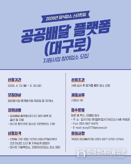 한국현대미술신문 정소영 기자 | 대구 달서구는 신규 외식업소의 조기 정착과 경영 안정화를 돕기 위해 ‘2026년 외식업소 스타트업 공공배달 플랫폼 지원사업’을 추진한다.