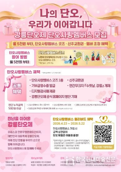 한국현대미술신문 원진 기자 | (사)강릉단오제위원회는 천년의 전통을 이어온 강릉단오제의 지속가능한 운영과 시민 참여를 위해 ‘단오사랑멤버스’를 모집한다고 밝혔다.