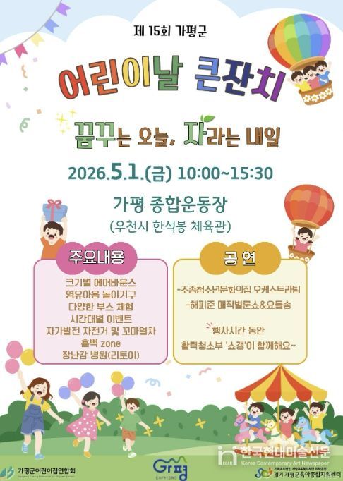 한국현대미술신문 배윤섭 기자 | 가평군은 오는 5월 1일 오전 10시 가평종합운동장에서 ‘제15회 가평군 어린이날 기념행사’를 개최한다. 가평군어린이집연합회와 가평군육아종합지원센터가 공동 주관하는 이번 축제는 기념행사와 공연, 놀이, 체험 부스 등 다채로운 프로그램으로 꾸며진다.