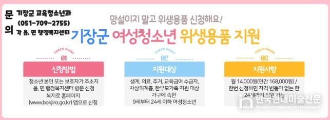 한국현대미술신문 정소영 기자 | 기장군은 ‘2026년 여성청소년 위생용품 지원사업’을 본격 추진한다고 23일 밝혔다.