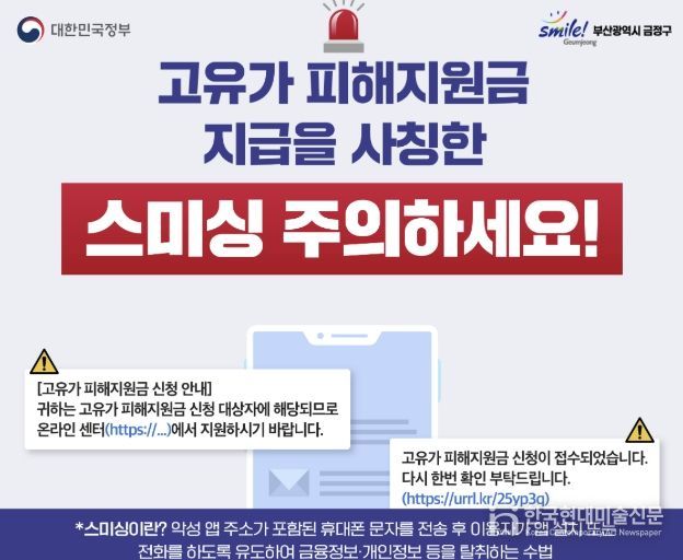 한국현대미술신문 정소영 기자 | 부산 금정구는 오는 4월 27일부터 ‘고유가 피해지원금’ 지급이 시작됨에 따라 이를 사칭한 스미싱(문자 결제 사기) 피해 예방을 위해 구민들에게 각별한 주의를 당부한다고 23일 밝혔다.