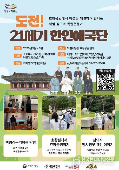 한국현대미술신문 배건 기자 | 서울 용산구가 내달부터 11월까지 지역 내 국가유산 서울 효창공원(효창원로 177-18) 일대에서 ’효창공원이 생생, 독립운동이 생생‘ 프로그램을 운영한다.