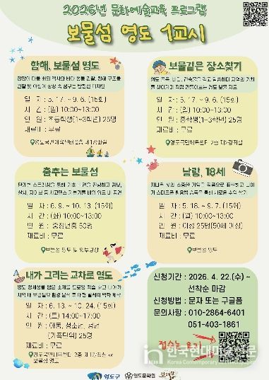 참여신청은 QR코드 또는 문자 접수를 통해 가능하며, 모든 프로그램은 무료로 운영된다. 기타 자세한 사항은 영도문화원 사무국으로 문의하여 확인할 수 있다