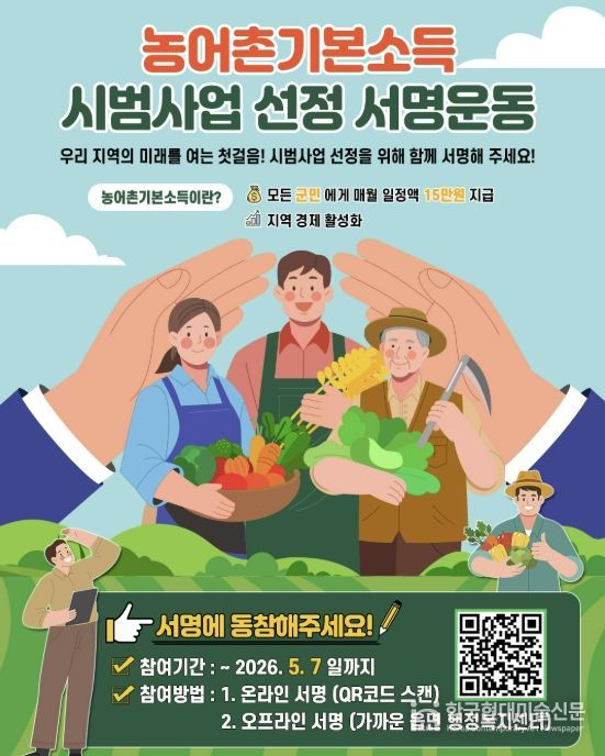 신미선 기획홍보과장은 "농어촌기본소득 시범사업 선정은 우리 지역의 미래를 여는 첫걸음"이라며 "지역의 내일을 바꾸는 서명운동에 적극 참여를 부탁드린다"고 말했다.