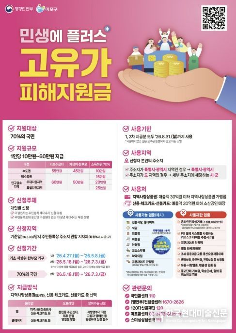 한국현대미술신문 배건 기자 | 마포구는 중동 전쟁 여파로 이어진 고유가·고물가 상황 속에서 구민의 경제적 부담을 덜고 지역경제에 활력을 불어넣기 위해 ‘고유가 피해지원금’을 지급한다.