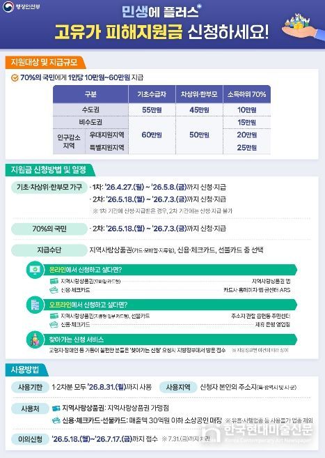 4월 27일부터 5월 8일까지 진행되는 1차 지급 대상은 기초생활수급자, 차상위계층, 저소득 한부모가족이다. 지원 금액은 ▲기초생활수급자 55만 원 ▲차상위계층·저소득 한부모가족 45만 원이다.