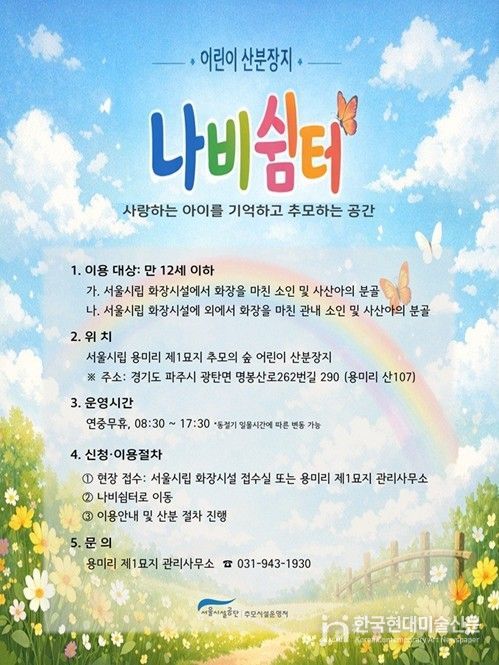 서울시는 5월 4일부터 용미리 제1묘지(경기도 파주시 소재) 추모의 숲 안에 약 500㎡ 규모 어린이 전용 산분장지 ‘나비쉼터’ 시범 운영에 들어간다고 밝혔다.