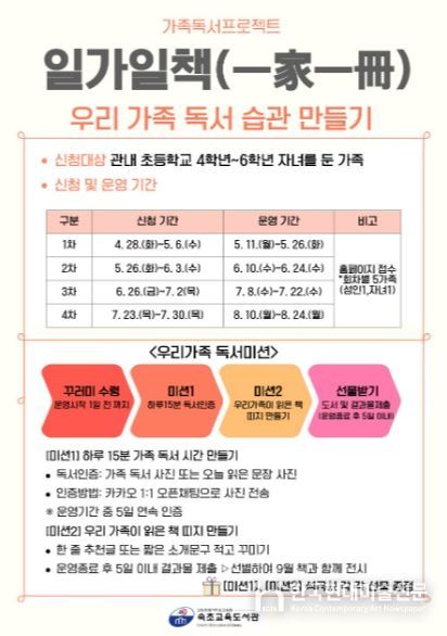 한국현대미술신문 원진 기자 | 속초교육도서관은 2026년 5월부터 8월까지 가족이 함께 책을 읽고 소통하는 독서문화 확산을 위해 가족 독서 프로젝트 ‘일가일책(一家一冊)’을 운영한다.