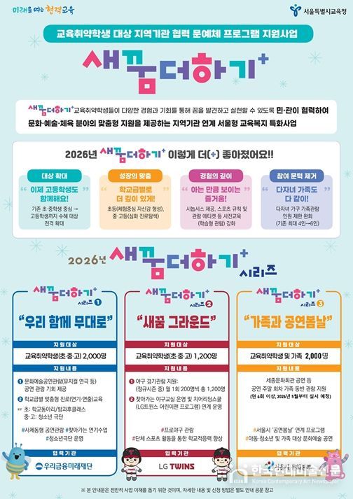 한국현대미술신문 배건 기자 | 서울특별시교육청은 교육취약학생에게 문화·예술·체육 및 진로탐색 기회를 제공하는 민관협력 교육복지 사업 ‘새꿈더하기’를 2026년 더욱 확대 운영한다고 밝혔다.