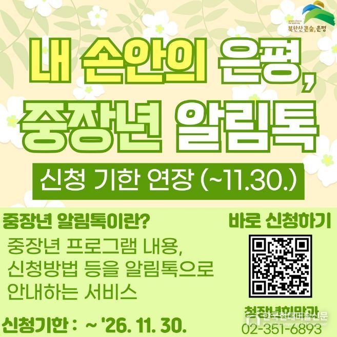 한국현대미술신문 배건 기자 | 서울 은평구는 중장년층의 정보 접근성을 높이고 프로그램 참여 기회를 확대하기 위해 ‘내 손안의 은평, 중장년 알림톡’ 서비스 신청 기간을 연장한다고 밝혔다.