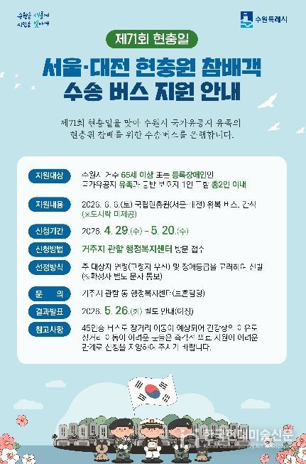 한국현대미술신문 배윤섭 기자 | 수원특례시가 제71회 현충일인 6월 6일, 국립현충원(서울·대전)까지 이동이 여의치 않은 국가유공자 유족을 위해 현충원 왕복 수송버스를 운행한다.