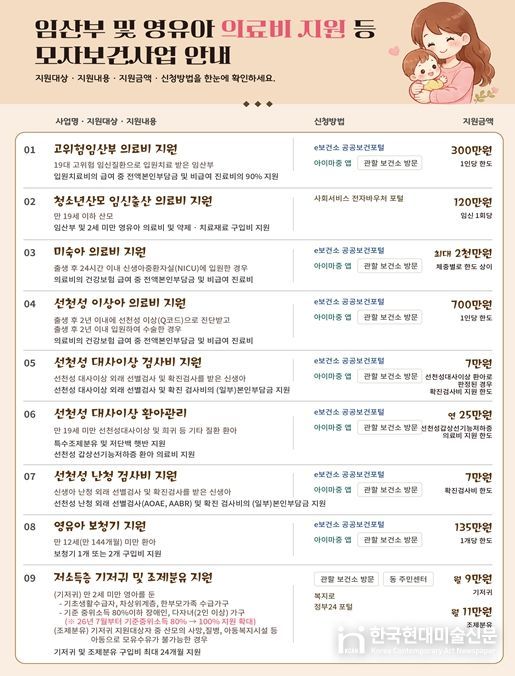 한국현대미술신문 배건 기자 | 지난해 2만여명의 서울 내 영유아와 임산부를 지원한 ‘모자보건 사업’이 올해는 지원대상은 더 확대하고 지원액은 더 늘린다. 우선 미숙아에 대한 의료비 지원을 현재 1,000만원에서 최대 2,000만 원까지 늘리고, 난청 환아 보청기 지원 연령도 만 5세에서 만 12세까지 대폭 높이는 등 임신부터 출산·양육까지의 전과정을 한층 촘촘하게 관리한다는 계획이다.
