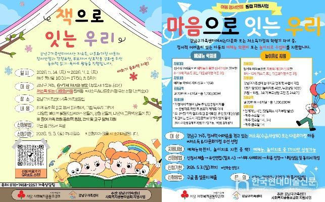 한국현대미술신문 배건 기자 | 꿈이 모이는 도시, 미래를 그리는 강남구가 저소득·다문화가정 아동의 건강한 정서 성장을 돕는 ‘책과 마음으로 잇는 우리’ 프로그램 참여자를 5월 3일까지 모집한다.