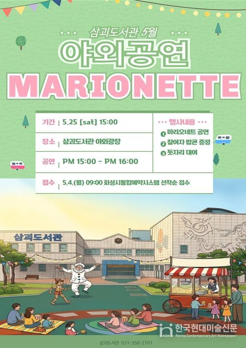 한국현대미술신문 배윤섭 기자 | 화성시립 삼괴도서관은 5월 가정의 달을 맞아 오는 5월 23일, 도서관 야외광장에서 가족 단위 이용자를 위한 특별한 문화행사를 운영한다. 따뜻한 봄날의 야외 공간에서 누구나 편안하게 즐길 수 있도록 마련된 이번 행사는 도서관을 찾는 시민들에게 색다른 문화 경험과 여유로운 시간을 제공할 예정이다.