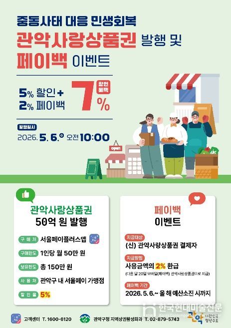 구는 오는 5월 6일 오전 10시부터 50억 원 규모의 관악사랑상품권을 발행한다. 이는 하반기에 발행 예정인 상품권 중 일부를 조기 발행한 것으로, 구 관계자는 “국가적 차원의 경제 위기 대응이 이루어지는 특수한 상황인 만큼, 정부 정책 기조에 부합하는 민생 안정 대책의 일환”이라고 설명했다.