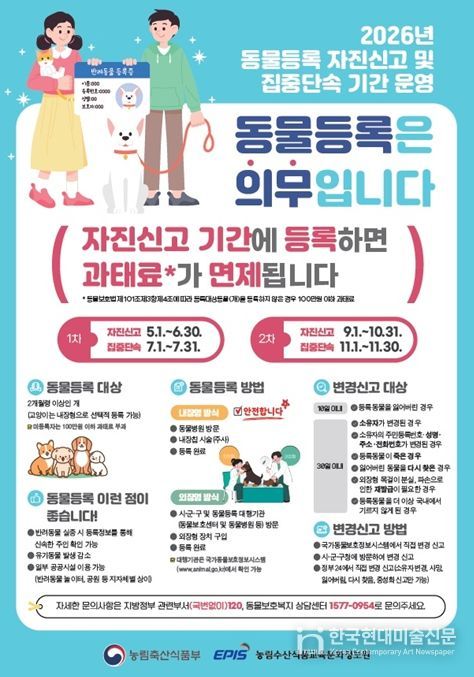 한국현대미술신문 박재남 기자 | 인천광역시는 반려견 등록 활성화와 등록 정보의 정확성 제고를 위해 2026년 동물등록 자진신고 기간(1차 5~6월, 2차 9~10월)을 운영한다고 밝혔다.