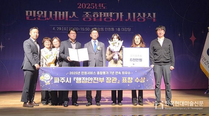 한국현대미술신문 배윤섭 기자 | 파주시는 지난 29일 정부세종청사 대강당에서 열린 녩년 민원서비스 종합평가’시상식에서 행정안전부 장관 표창을 수상하고, 시상금으로 특별교부세 6천만 원을 확보했다.