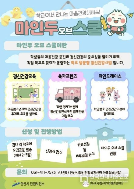한국현대미술신문 배윤섭 기자 | 안산시 정신건강복지센터는 11월까지 관내 초·중·고등학교 총 10개교를 대상으로 학교로 찾아가는 정신건강사업 ‘마인두 오브 스쿨’을 운영한다고 30일 밝혔다.