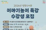 한국현대미술신문 배윤섭 기자 | 양평군은 새 학기를 맞아 양동도서관에서 초등학생을 대상으로 운영하는 ‘이야기 놀이 특강’의 수강생을 오는 22일부터 26일까지 모집한다고 밝혔다. 이번 특강은 옛 설화 속 주인공이 되어 또래와 협력해 이야기를 만들어 보는 스토리텔링 프로그램이다. 시나리오 속에서 나만의 캐릭터를 만들고 싶은 초등학교 3~6학년 학생이라면 누구나 신청할 수 있다. 강좌는 3월 11일 오후 3시 30분부터 약 3시간 동안 참여형 프로그램으로 진행되며, 장소는 양동도서관 3층 강의실이다. 전진선 양평군수는 “앞으로 양동도서관이 어린이들에게 다양한 독서문화 프로그램을 제공하고, 이번 특강이 초등학생들의 문해력 향상에 도움이 되기를 바란다”고 전했다.