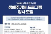 한국현대미술신문 박재남 기자 | 인천시 남동구 구립도서관은 3~12월까지 운영하는 ‘2026년 상·하반기 생애주기별 프로그램’에 함께 할 프로그램 강사를 공개 모집한다고 12일 밝혔다. 올해 구립도서관 4개관(남동논현, 소래, 서창, 만수2동어린이도서관)의 생애주기별 프로그램은 10개 분야로 구성돼 운영될 예정이다. 강사 모집은 유아·아동 대상의 영어·한국사·생태·미술·전래놀이·경제 등 8개 강좌와 성인 대상의 책 놀이·영어독서 지도 교육 등 2개 강좌를 대상으로 한다. 관련 분야 전공자, 교육과정 이수자, 자격증 소지자, 강의 경력자라면 누구나 강사로 지원할 수 있다. 지원자는 강사지원서·강의계획서·자기소개서 등 서류를 준비해 1월 16일까지 남동논현도서관 또는 서창도서관에 방문하거나 이메일을 통해 제출하면 된다. 구는 매년 강사 공개 모집을 통해 여러 분야의 우수한 강사를 발굴·선발하여 생애주기별 프로그램을 진행하며, 지역주민의 교육적 삶의 질 향상과 독서문화 활성화를 통해 지역 내 독서문화 진흥을 도모할 수 있기를 기대하고 있다. 자세한 사항은 남동구립도서관 홈페이지