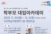 한국현대미술신문 배건 기자 | 구로구가 예비 수험생 학부모를 대상으로 ‘2027학년도 학부모 대입 아카데미’를 운영한다. 구는 변화하는 대입 제도와 입시 환경 속에서 학부모가 정확한 정보를 이해하고, 자녀의 진로·진학을 체계적으로 지원할 수 있도록 매년 학부모 대입 아카데미를 운영하고 있다. 교육은 구로구 관내 예비 수험생(중학교 3학년∼고등학교 2학년)을 둔 학부모 50명을 대상으로 구로학습지원센터 1관 대강의실에서 진행된다. 이번 프로그램은 △11월 25일 ‘고교학점제 대비 및 2028학년도 대입 제도 분석’ △11월 27일 ‘학종 성공을 위한 과목 선택과 내신 1등급 만들기 공부 비법’ △12월 2일 ‘2027학년도 대입 전형의 이해와 수시모집 성공전략 세우기’ △12월 4일 ‘주제탐구활동을 하면 학생부가 왜 특별해 보일까?’ 등 총 4회에 걸쳐 매회 오후 7시부터 9시까지 2시간 동안 이어진다. 강의는 진학 멘토 ‘신의 한 수’ 입시전략연구소 김용택 대표가 나서 학부모가 자녀와 함께 실천할 수 있는 현실적인 진학 지도 방안과 대입 준비에 필요한 핵심 정보를 전달할 예정이다. 참여