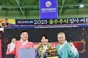 한국현대미술신문 신정은 기자 | 증평군청 인삼씨름단(감독 연승철, 코치 서수일) 소속 이완수 선수가 울산광역시 울주군 울주종합체육관에서 열린 ‘위더스제약 2025 울주추석장사씨름대회’에서 소백장사(72kg이하) 타이틀을 거머줬다. 이완수 선수는 4일 열린 결승전에서 울주군청 소속 김덕일 선수를 접전 끝에 3-2로 제압, 개인 통산 세 번째 장사에 오르는 영예를 안았다. 이 선수는 8강에서 임주성(MG새마을금고씨름단), 4강에서 이현서(의성군청) 선수를 각각 2-1로 승리하며 결승에 진출했다. 결승전에서는 홈그라운드 이점을 안고 나온 김덕일 선수에게 초반 두 판을 내줬으나, 3판째 김 선수의 경고패로 한 점을 만회하며 분위기를 바꿨다. 이후 두 판 연속 강력한 잡채기로 상대를 넘어뜨리며 극적인 역전승을 거뒀다. 이번 우승으로 이 선수는 지난 ‘2025 설날장사씨름대회’ 소백장사에 이어 올 시즌 2관왕을 달성, 씨름 명문 증평군청 인삼씨름단의 위상을 다시 한 번 높였다. 연승철 감독은 “증평군민들에게 추석장사씨름대회에서 승리의 소식을 안겨주게 돼 매우 기쁘다”며 “이번 대회 남은 체급에서도
