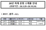 한국현대미술신문 원진 기자 | 원주공항의 2026년 하계(3월 29일∼10월 24일) 제주 항공편이 동계와 같이 오전·오후 시간대 편성으로 유지된다. 원주공항에 취항한 진에어의 하계 항공기 운항 일정이 국토교통부의 최종 승인으로 확정됨에 따라, 이전과 같이 오전·오후 시간대 편성이 유지되며 출발시간만 일부 변경된다. 3월 29일부터 원주공항에서 출발하는 제주행 항공편은 종전 오전 11시 10분·오후 4시 35분에서 오전 11시 15분·오후 5시 20분으로 변경되며, 제주에서 원주공항으로 돌아오는 항공편은 종전 오전 9시 5분·오후 2시 30분에서 오전 9시 5분·오후 3시 20분으로 조정된다. 한편 2025년 원주공항을 이용한 탑승객 수는 20만 1,916명으로, 2023년부터 3년 연속 20만 명을 돌파하고 있다. 탑승률 또한 2021년부터 2025년까지 57.7%→73%→78.8%→78.9%→77.1%를 기록하며 80%에 근접하는 추세를 보였다. 원강수 원주시장은 “원주공항의 구조적 불편함이 개선되고 이용객 편의시설 등이 확충되면 더 많은 수요가 발생할 것”이라며, “내년 개항 30주년을 맞이하