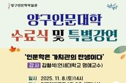 한국현대미술신문 원진 기자 | 양구군은 8일 양구인문학박물관 세미나실에서 인문대학 수료식 및 특별강연을 진행한다. 양구 인문대학은 올해 4월부터 11월까지 매월 1회 ‘조화와 균형의 인문학’을 주제로 운영됐다. 인문학 전문 강의를 통해 군민의 인문학적 소양을 함양하고, 양구군을 인문학 중심도시로 육성하기 위한 기반을 마련하고자 추진됐다. 올해 인문대학에는 총 53명이 접수해 이 중 25명이 수료한다. 수료식에서는 전체 강의의 80% 이상을 이수한 수강생에게 양구군수와 김형석 명예교수 명의의 수료증이 수여된다 수료식 이후에는 김형석 명예교수가 ‘인문학은 가치관의 탄생이다’를 주제로 특별강연을 진행한다. 강연에서는 급변하는 현대사회 속에서 개인의 사유, 가치 판단, 삶의 태도 형성에 있어 인문학이 갖는 의미를 되짚어볼 예정이다. 진행된 강좌 △고미술과 현대미술의 균형적 이해 △소통을 위한 공감 독서법 △진심을 담은 옛 사람들의 소통법 △기계와 짐승 사이에서 △덜 소비하고 더 나누는 삶 △어머니의 밥상을 찾아서: ‘귀향’ 등에서 다양한 인문학적 관점을 다뤄 수강생들의 높은 호응을 받았다. 임