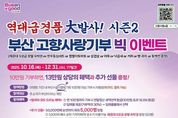 한국현대미술신문 정소영 기자 | 부산시는 오늘(16일)부터 12월 31일까지 77일간, 고향사랑기부제 참여 확산을 위해 '역대급 경품 대발사 시즌2! 부산 고향사랑기부제 연말 빅 이벤트'를 개최한다고 밝혔다. 지난 5월 진행된 ‘역대급 경품 대발사’ 이벤트는 해운대 5성급 호텔 숙박권을 포함한 푸짐한 경품으로 많은 시민들의 뜨거운 관심과 참여 속에 성황리에 마무리됐다. 이번 시즌2 이벤트는 그 성원에 힘입어 더욱 풍성한 혜택과 경품으로 시민들을 다시 한번 찾아온다. 특히, 올해 10월 17일부터 부산에서 개최되는 제106회 전국체육대회와 연계해 이번 이벤트를 가을부터 연말까지 이어가며, 시민들에게 다채로운 혜택과 즐거움을 제공할 계획이다. 이와 함께 시는 전국체전 기간(10.17.~10.23.)과 전국장애인체전 기간(10.31.~11.5.)에 ‘고향사랑기부제 홍보 공간(부스)’을 운영해 현장 방문객들에게 기부제 취지와 참여 방법을 적극 알릴 예정이다. 또한 이벤트 기간 중 시청에 1회 10만 원 이상 기부한 기부자에게 기본혜택 2가지와 함께 특별한 추가 경품 4가지를 증정한다. &nbs