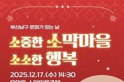 한국현대미술신문 정소영 기자 | 부산 남구는 오는 12월 17일 오후 2시 30분, 우암동 소막마을 주택에서 2025 남구 문화가 있는 날 '소중한 소막마을, 소소한 행복' 공연을 개최한다고 밝혔다. 이번 공연은 역사적 의미가 담긴 소막마을 주택을 지역 문화공간으로 활용하여, 주민들이 일상에서 자연스럽게 문화예술을 접할 수 있도록 마련됐다. 무대는 마술 풍선쇼, 합창, 퓨전국악, 트로트 등 다양한 장르로 구성되어 남녀노소 누구나 부담 없이 즐길 수 있는 무대로 꾸며진다. 특히 소막마을 주택의 아늑한 분위기가 더해져 ‘작지만 소중한 행복’을 나누는 따뜻한 연말 공연이 될 것으로 기대된다. 오은택 남구청장은 “일상 가까이에서 이웃과 함께 문화를 즐기는 경험은 지역 공동체의 정서 교류에 큰 의미가 있다”며 “많은 분이 오셔서 따뜻한 무대와 즐거운 공연을 함께하시길 바란다”고 전했다.