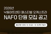 한국현대미술신문 정소영 기자 | 부산 강서구는 서부산 최초의 클래식 전문 공연장인 낙동아트센터와 함께할 ‘낙동아트센터 페스티벌 오케스트라(NAFO)’ 단원을 공개 모집한다고 밝혔다. 이번 모집을 통해 강서구는 수준 높은 음악적 역량과 열정을 지닌 연주자들로 오케스트라를 구성해, 향후 낙동아트센터에서 품격 있는 클래식 공연을 시민들에게 선보일 계획이다. NAFO는 내년 1월 낙동아트센터 정식 개관 기념 무대에서 말러 교향곡 제8번, 오페라 아이다, 발레 백조의 호수 등 세계적인 명작을 연주할 예정이다. 이에 앞서 오는 12월 24일, 말러 교향곡 제8번과 베토벤 교향곡 제9번 4악장을 연주하는 프리뷰 콘서트를 개최해, 정식 개관 전부터 웅장한 음악의 울림을 선사하며 낙동아트센터에 대한 시민들의 기대감을 높일 전망이다. 모집 분야는 ▲오케스트라 악장 ▲수석 ▲단원 ▲기획지원단원이며, 만 18세 이상이면 누구나 지원 가능하다. 접수 기간은 10월 10일부터 16일 오후 5시까지로, 강서구청 홈페이지에서 참여신청서를 내려받아 전자메일로 제출하면 된다. 전형은 기획지원단원의 경우 면접, 오케스트라 단원의 경