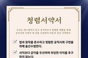 한국현대미술신문 정소영 기자 | 대구 동구청은 청렴 문화 확산과 공직기강 확립을 위해 청렴한 생활을 통해 모범이 될 것을 다짐하는 ‘청렴서약서’를 제작해 구청 부서 및 동행정복지센터 출입구에 부착했다. 서약서에는 △법과 원칙 준수 △공익 우선 △금품·향응 수수 금지 △공정하고 객관적인 직무 수행 등의 내용이 담겼다. 김태운 동구청장 권한대행은 “청렴은 선택이 아닌 공직자가 갖춰야 할 가장 중요한 가치”라며 “전 직원이 책임감을 느끼고 구민들에게 신뢰받는 투명한 행정을 펼쳐 나가겠다”고 말했다.