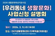 한국현대미술신문 정소영 기자 | 대구문화예술진흥원은 2월 13일부터 3월 6일까지 2026 생활문화육성지원사업 '우리동네 생활문화'에 참여할 생활문화 공간 및 연계 기획단체를 공개 모집한다. ‘우리동네 생활문화’는 지역 내 새로운 생활문화 공간을 발굴하고, 생활문화 기획 프로그램 운영을 통해 커뮤니티 기반 생활문화 공간 조성을 지원하는 사업이다. 올해는 대구 전 지역을 대상으로 신규 생활문화 공간 발굴과 함께 생활문화 활동이 부족한 권역(계층·지역)의 활성화 및 지속 가능한 공동체 육성에 중점을 두고 운영된다. 공모 대상은 대구에 소재한 생활문화 활동이 가능한 공간과 생활문화 기획 역량을 갖춘 단체(문화콘텐츠 관련 예술가·기획자·활동가 등으로 구성된 단체)가 연계된 단체가 대상이다. 올해는 총 10개 내외의 단체를 선정할 예정이며 선정된 단체에는 단체당 550만 원의 사업비 지원과 함께 ‘우리동네 생활문화 지도’ 플랫폼 내 통합 홍보 등을 지원할 예정이다. 공모에 앞서 2월 11일 14시, 대구생활문화센터에서 사업설명회가 진행되며, 사업 신청은 2월 13일부터 3월 6일까지 국가문화예